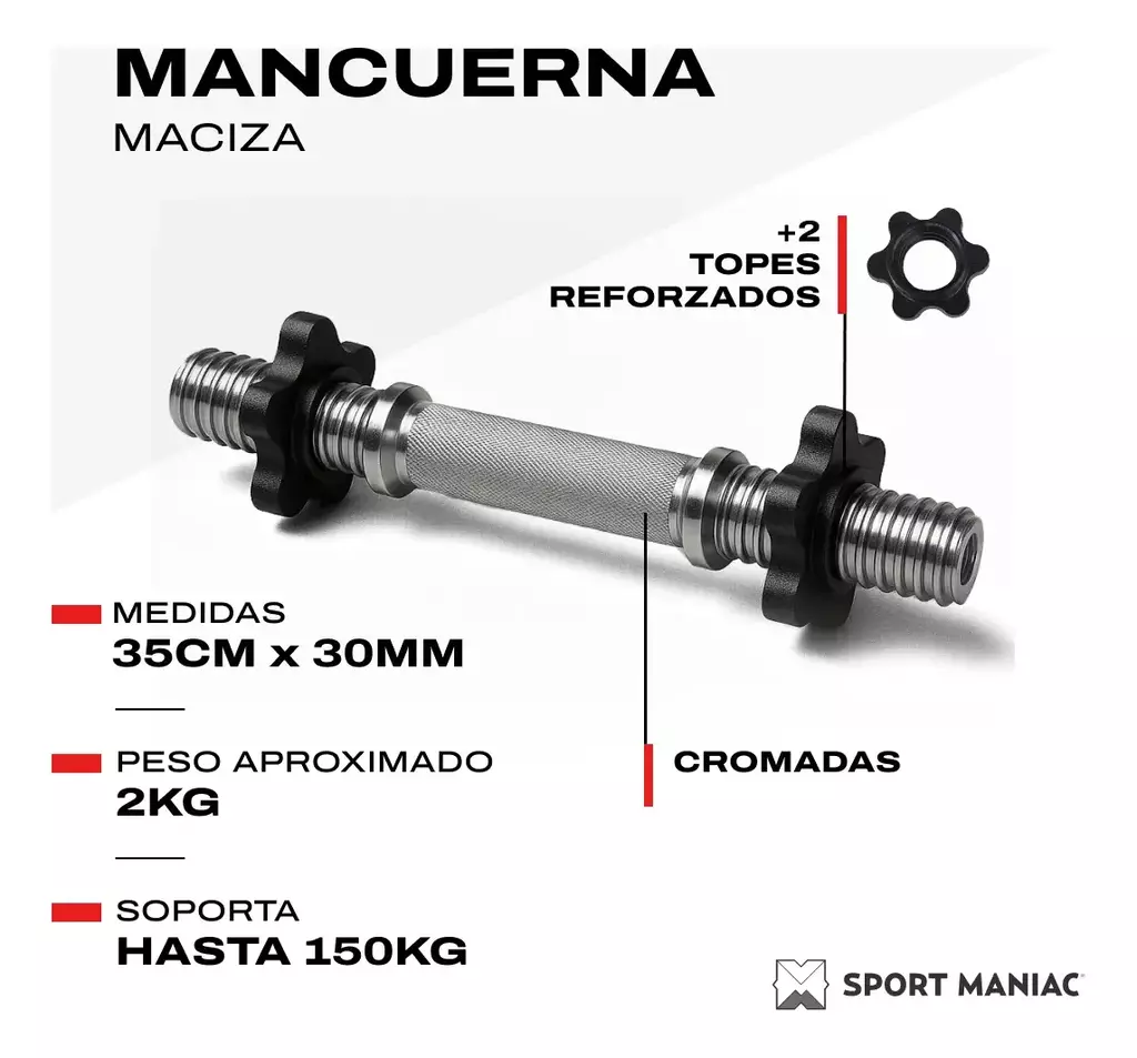 - 2 mancuernas a rosca macizas de trafilado crudo con topes de PVC, que garantizan seguridad y durabilidad.