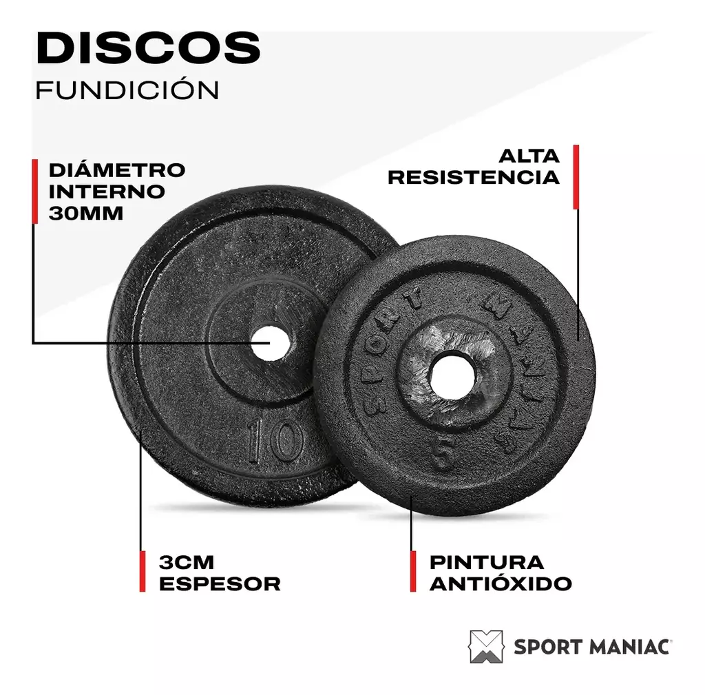 - 25 kg en discos de fundición, ideales para ir aumentando progresivamente la carga de tus ejercicios.