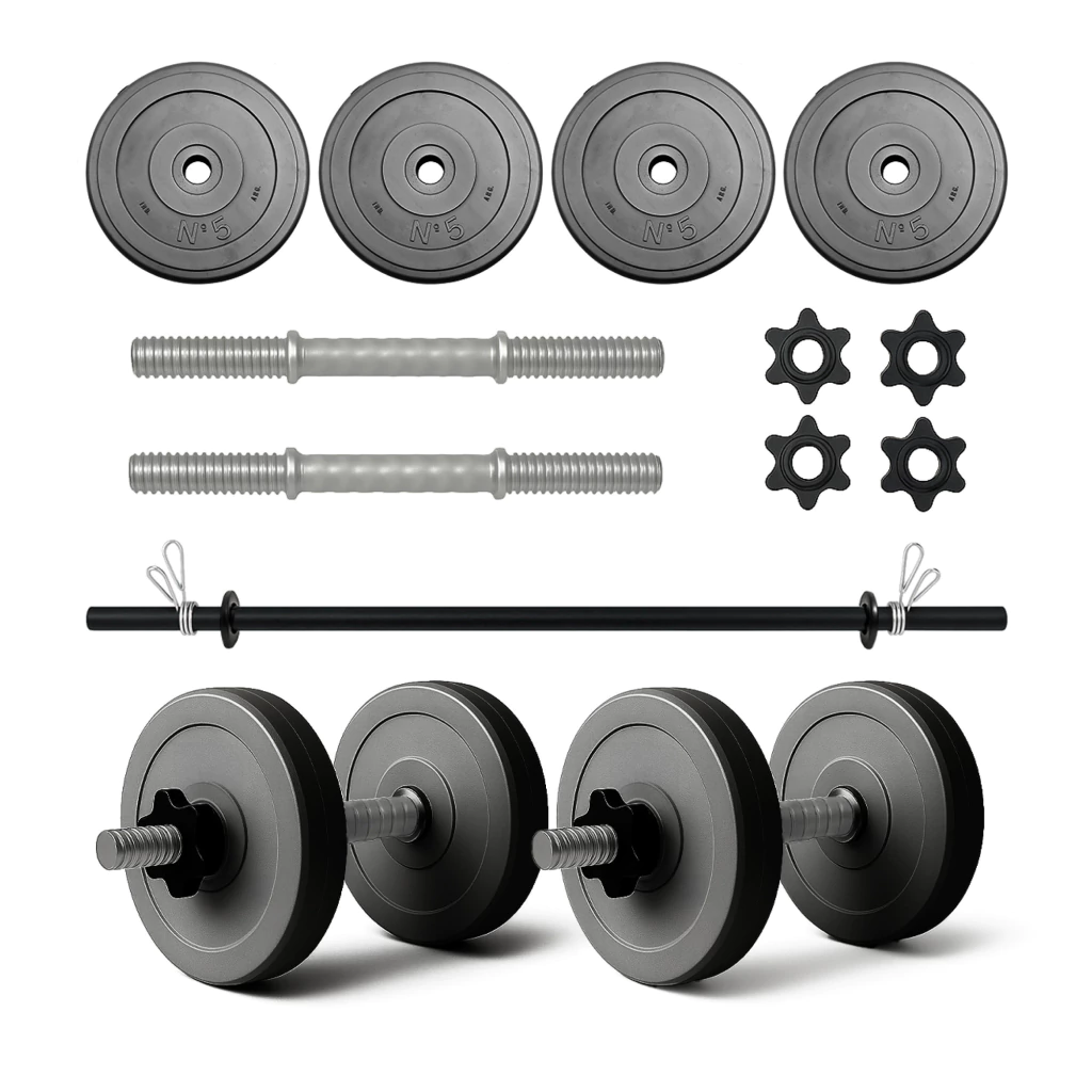 Este combo completo de pesas y mancuernas es la solución ideal para quienes buscan un entrenamiento integral en casa. Con un total de 20 kg en discos recubiertos en PVC, podrás realizar una amplia variedad de ejercicios para fortalecer y tonificar tu cuerpo, reduciendo el estrés y mejorando tu bienestar general.