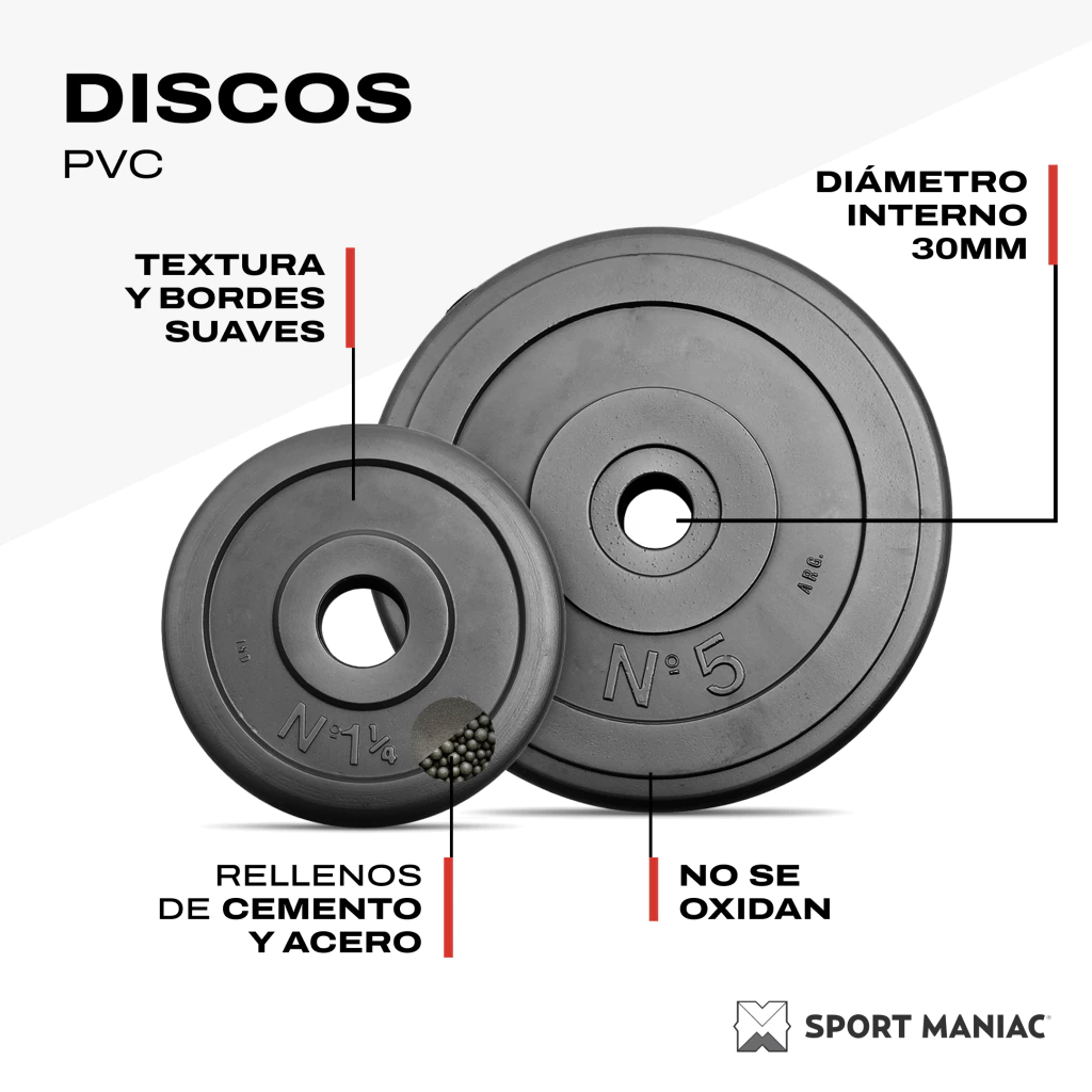 - Discos: Diámetro interno de 30 mm, recubiertos en PVC ultra resistente